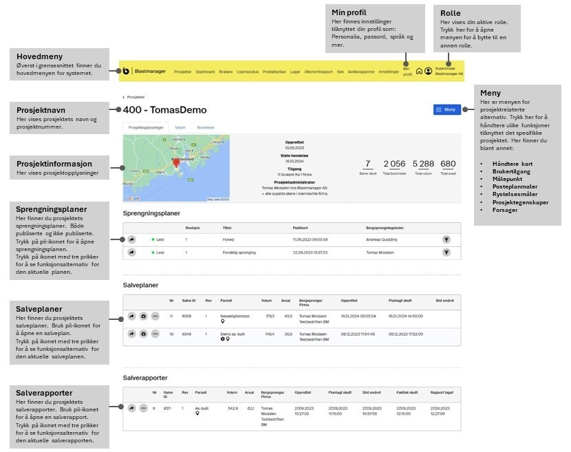 Når du er på et bestemt prosjekt havner du på prosjektets hovedside. Det gir deg en god oversikt over hva som er gjort og hva som må gjøres på prosjektet. Her kan du blant annet ta del i grunnleggende prosjektinformasjon, bore- & salveplaner, sprengningsplan, salverapporter og den prosjektrelaterte menyen, som du åpner med den blå "Meny-knappen" øverst til høyre i grensesnittet. Du kan alltid bruke hus-ikonet i øvre høyre hjørne for å navigere tilbake til prosjekt hovedsiden.