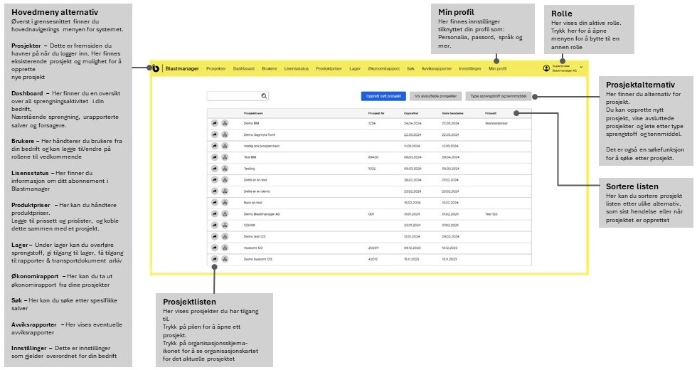 Når du logger på Blastmanager ender du opp som utgangspunkt på siden som heter prosjektoversikt. Det gir deg god oversikt over alle prosjekter du har tilgang til og derfra kan du navigere deg frem til ønskede oppgaver som opprett nytt prosjekt, ny sprengningsplan, les sprengningsplan, ta ut økonomiske rapporter og så videre. Hva du har tilgang til avgjøres av rollene du er tildelt. Les mer om de ulike rollene i systemet her.