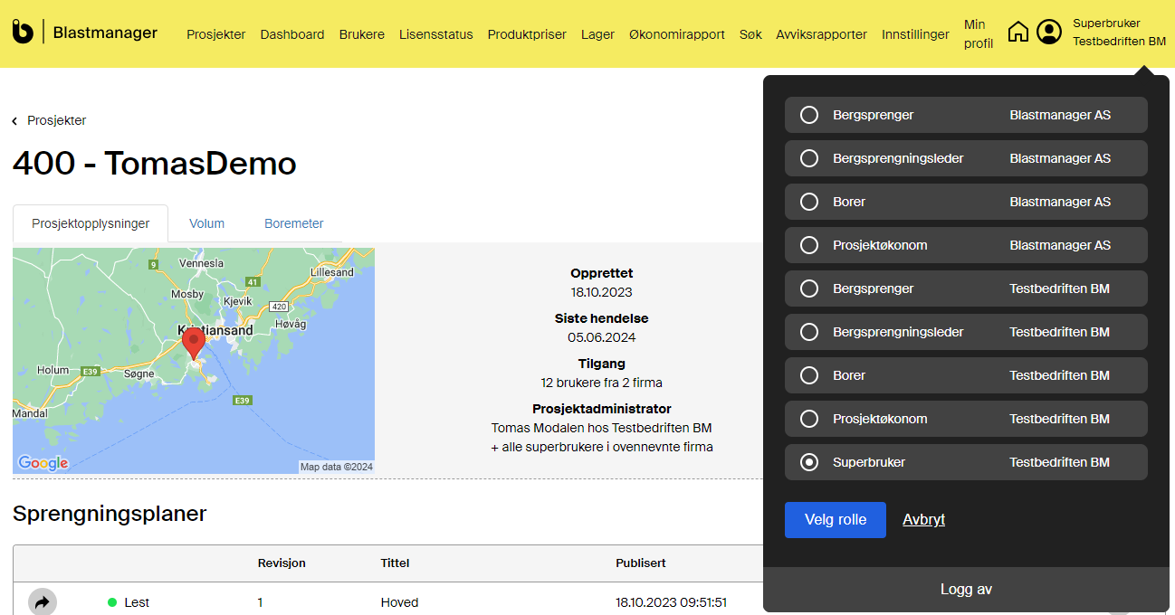 Blastmanager er designet slik at du, avhengig av din rolle i systemet, har tilgang til ulike deler og funksjoner. Du kan se hvilken rolle du er tildelt øverst til høyre i grensesnittet, og her kan du bytte roller i tilfeller der du er tildelt flere roller.