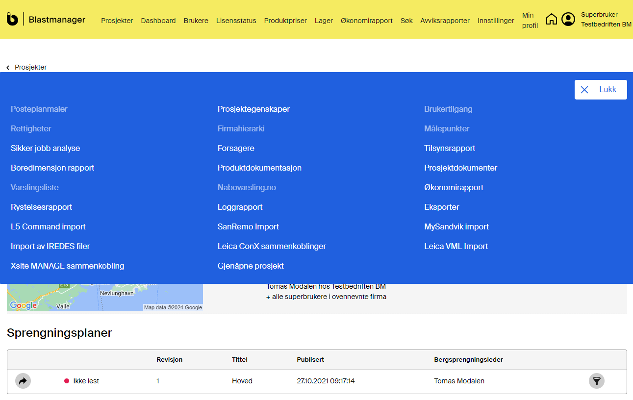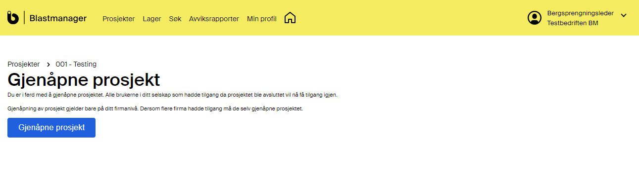 Det kan være at et avsluttet prosjekt starter opp igjen eller at du vil gjøre endringer i et allerede avsluttet prosjekt. Som Superbruker og Bergsprengningsleder har du derfor mulighet til å gjenoppta avsluttede prosjekter.