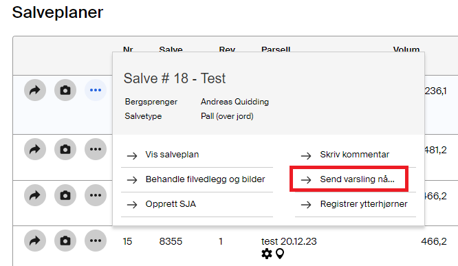 Trykk på trepunktsmenyen for gjeldende salve og velg "Send varsling nå"