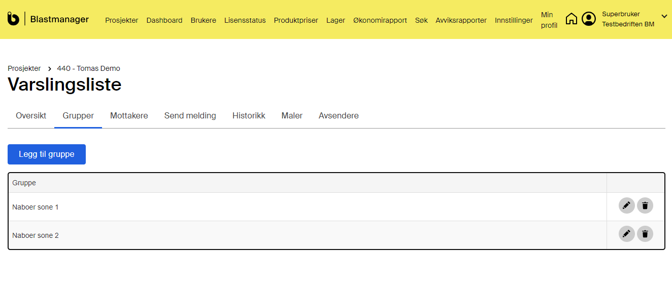 For å sende SMS-varsling ved sprengning, må det opprettes en varslingsliste med tilhørende mottakere: