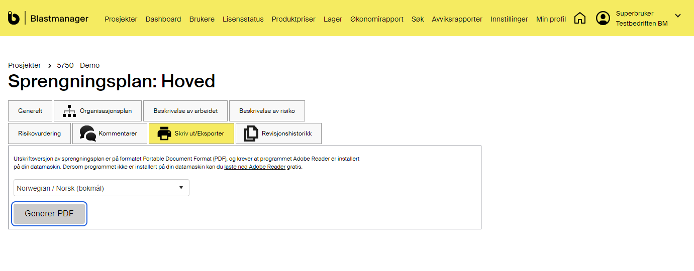 Om du vil skrive ut sprengningsplanen eller lagre den som PDF-fil, gjør du slik: