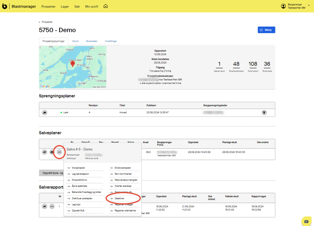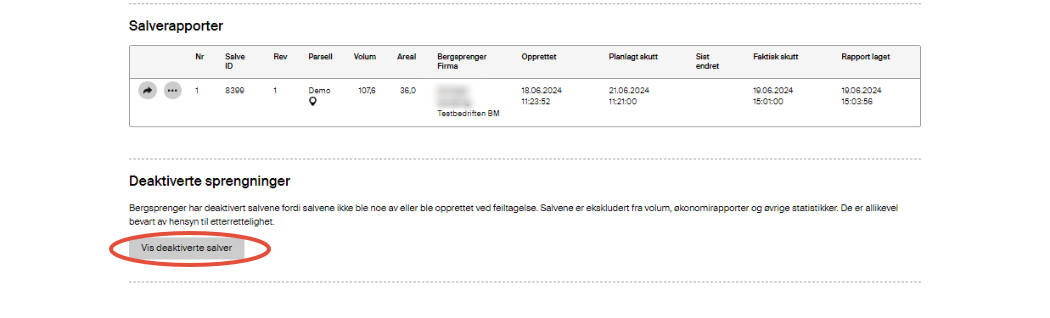 MERK! Ved deaktivering av salveplan vil as-built borehull som er knyttet til salveplanen vil bli fjernet fra planen automatisk. Hullene blir igjen tilgjengelige for registrering på en annen salveplan.