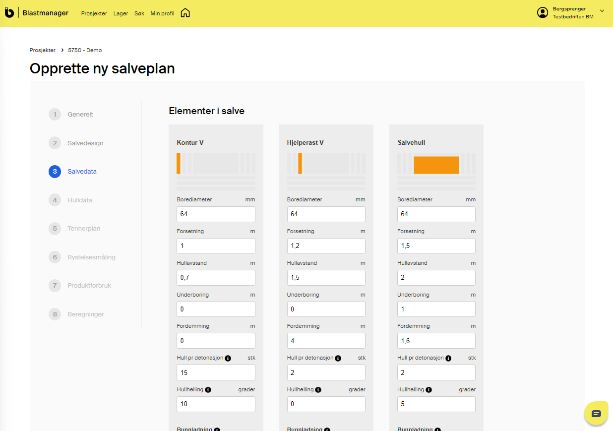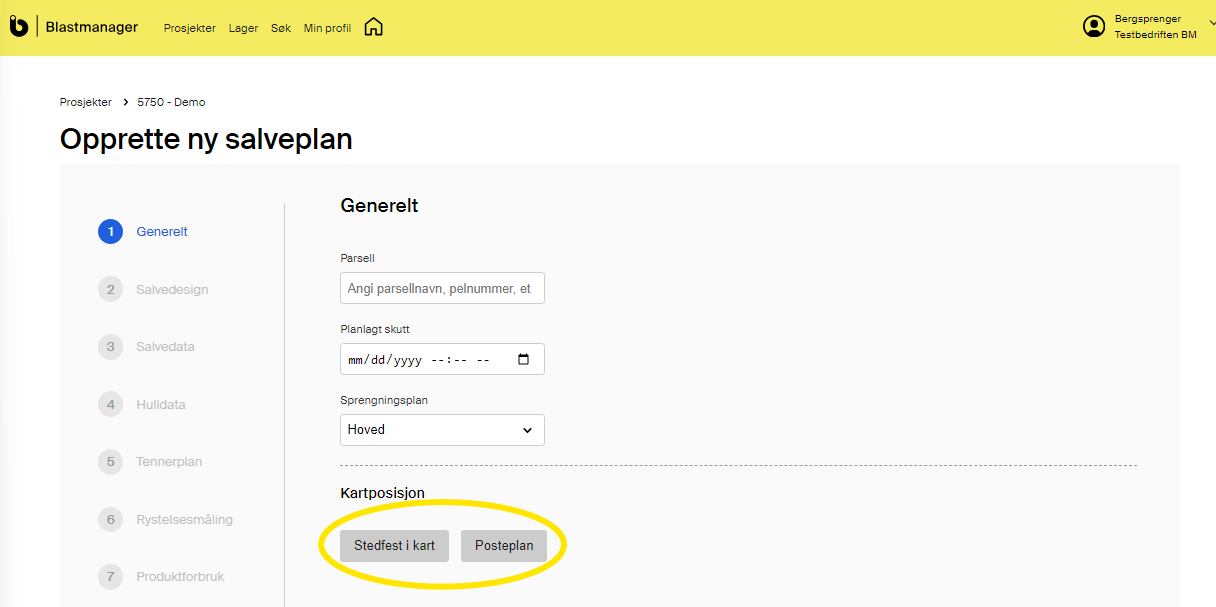 I første del av planen fyller du ut parsellnavn, pel-nummer eller egendefinert navn på salven og dato/tidspunkt for når salven er planlagt avfyrt. Du velger også hvilken sprengningsplan salven skal være knyttet til dersom prosjektet har flere sprengningsplaner.