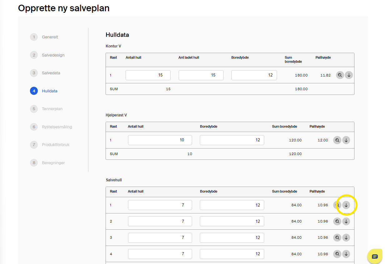 Her fyller i ut antall hull og boredybde per rast i hvert element. Det er anbefalt å legge inn snittdybde per rast, og ikke for hele salven.
