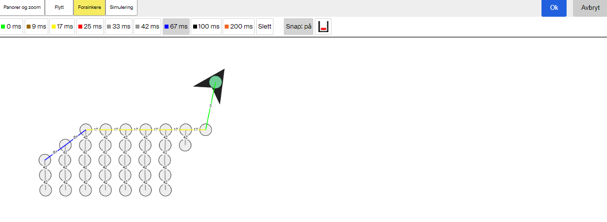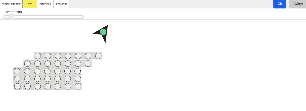 I denne fanen har du mulighet til å flytte rastene og andre elementer i salven. Du kan også endre skyteretning ved å dra i slideren "Skyteretning".