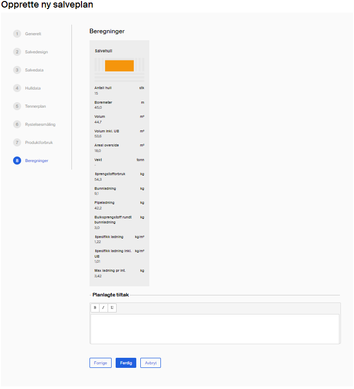 Dette er siste steg i salveplanen, her får du opp beregninger basert på de verdiene du la inn i de tidligere stegene.