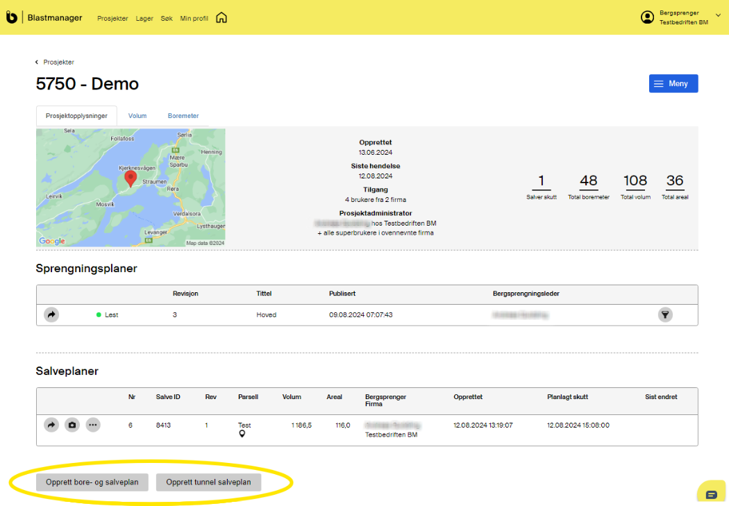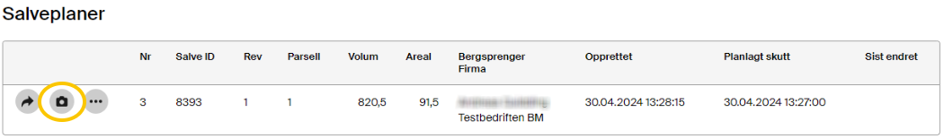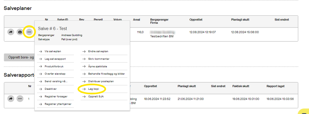 Når du er logget inn som bergsprenger kan du enkelt opprette salveplaner ved å trykke på knappen "Opprett bore- og salveplan", eller ved å trykke på trepunktsmenyen til en tidligere plan / rapport og velg "lag kopi".