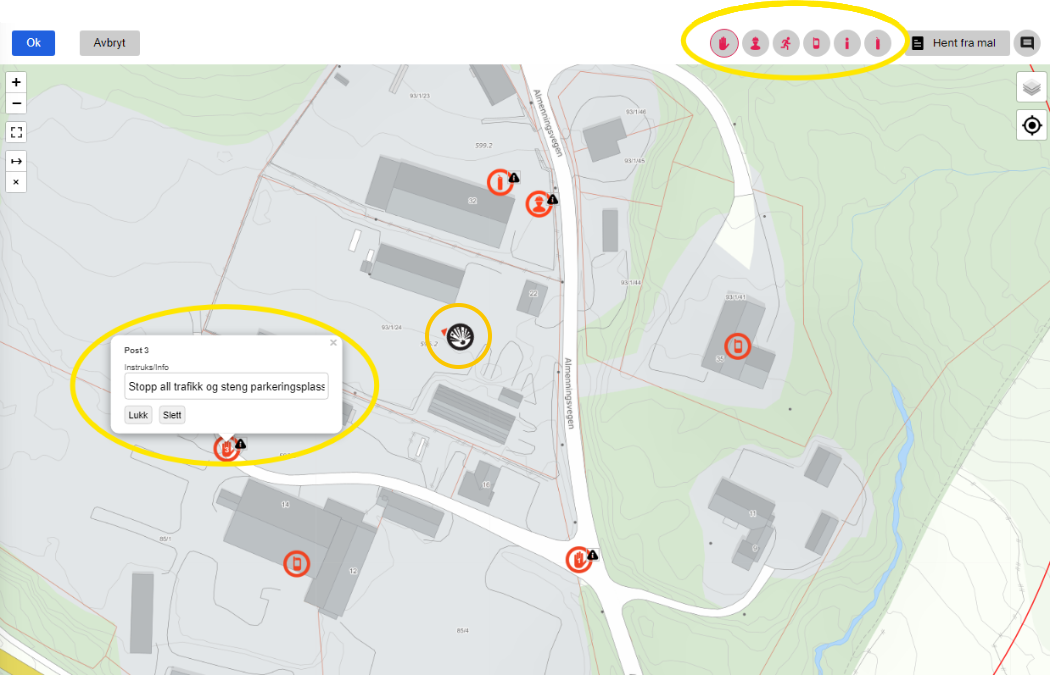 I posteplanen plasserer du enkelt ut poster i kartet ved å trykke på det ikonet du ønsker, og deretter i kartet.