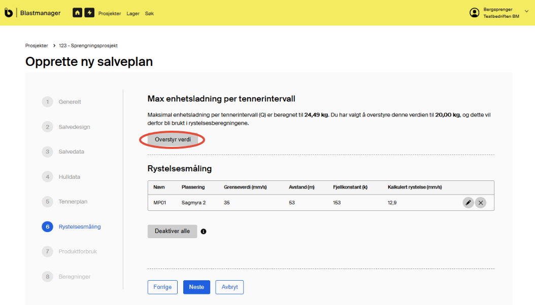 Dersom ikke den kalkulerte enhetsladningen er nøyaktig nok, kan du overstyre den med den enhetsladningen du selv har beregnet. Dette er nyttig på salver med små marginer og vil bidra til en mer nøyaktig kalkulering av vibrasjoner.