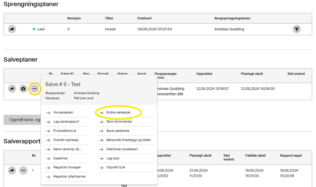 For å endre en eksisterende salveplan velger du "Endre salveplan" i trepunktsmenyen til salveplanen.