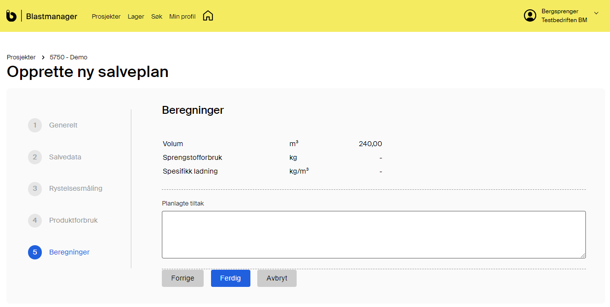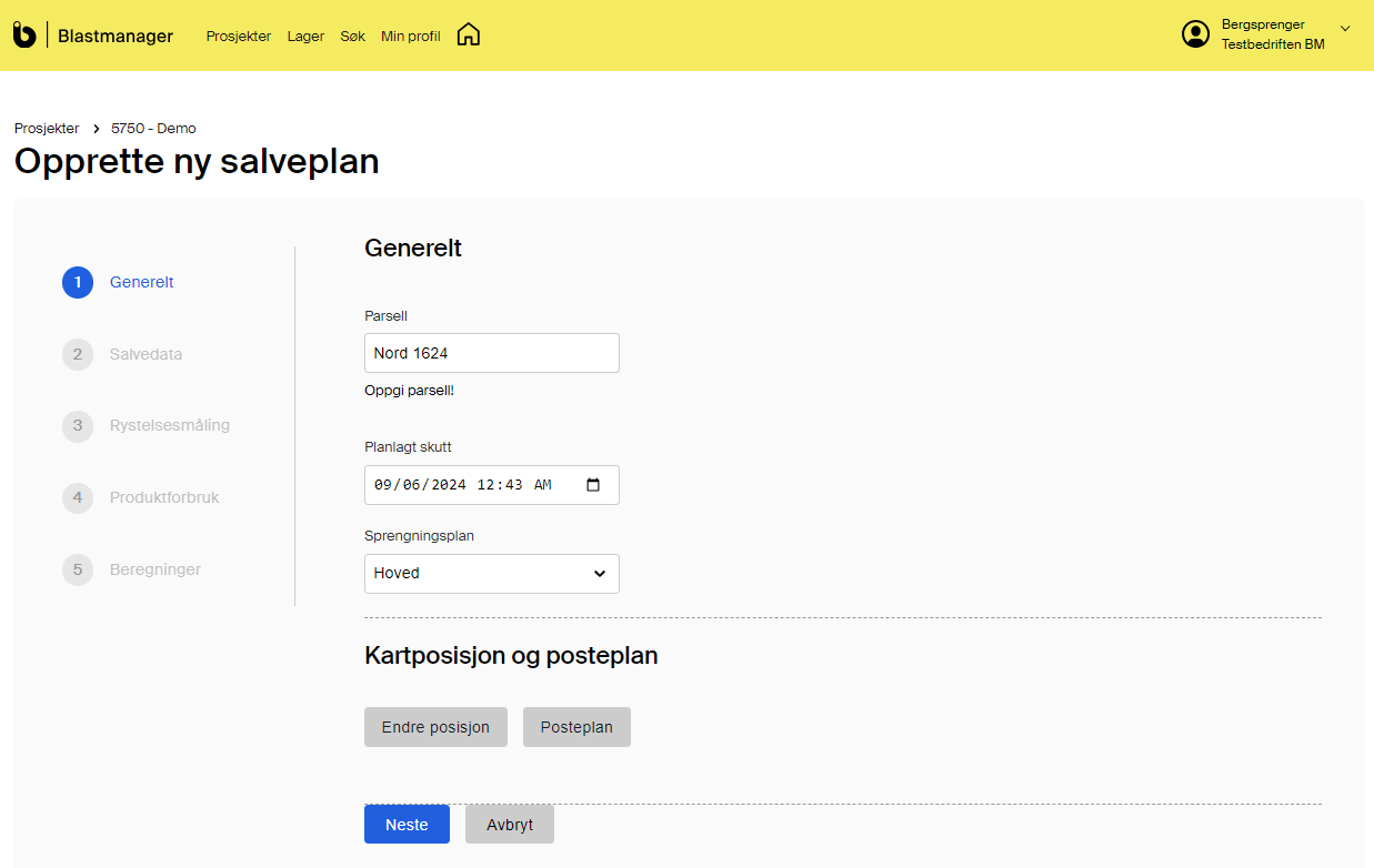 - Fyll inn i feltene Parsell, Planlagt skutt og velg hvilken Sprengningsplan som skal knyttes til salven. Stedfest salven i Kart, og lag en posteplan.