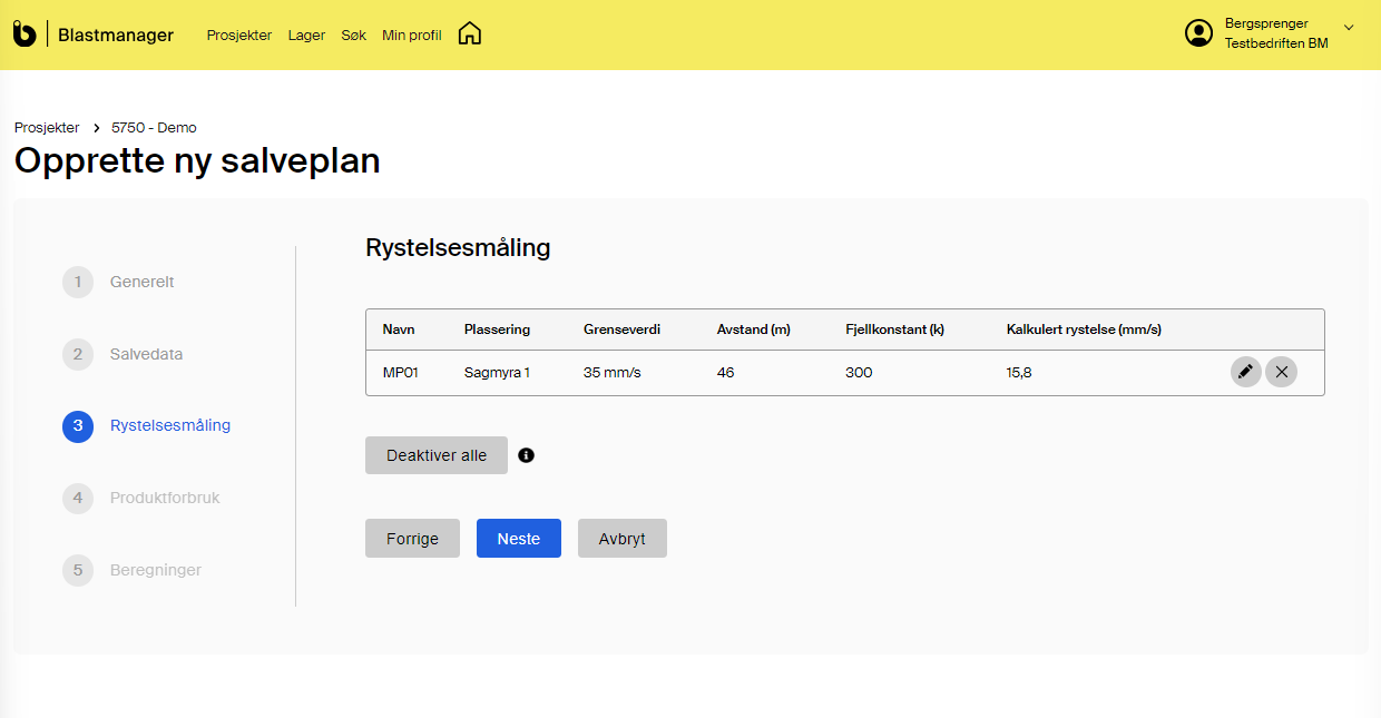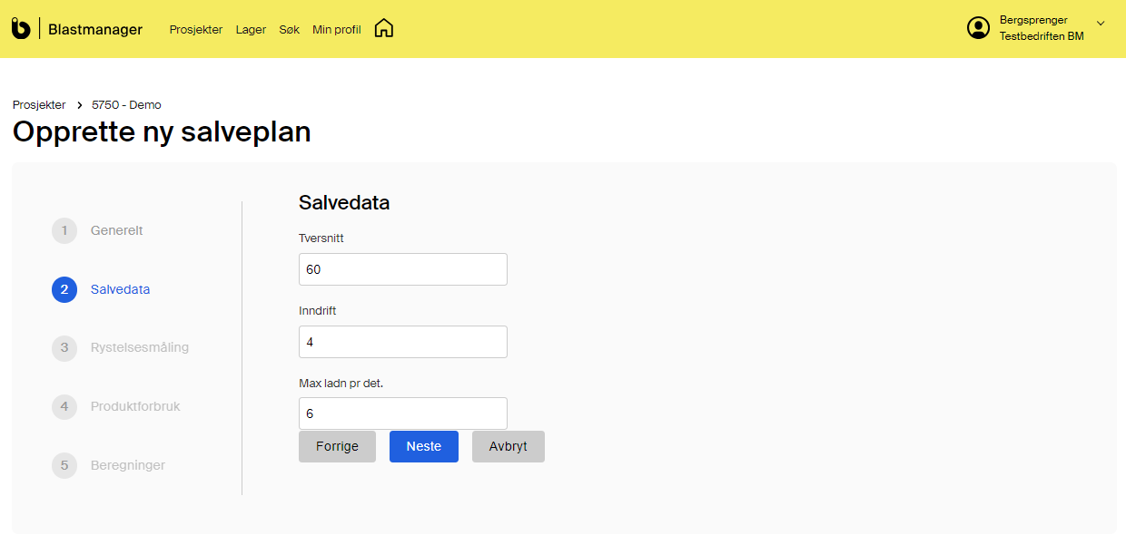 - Her legger du inn tverrsnitt, inndrift, og maks ladning per detonasjon