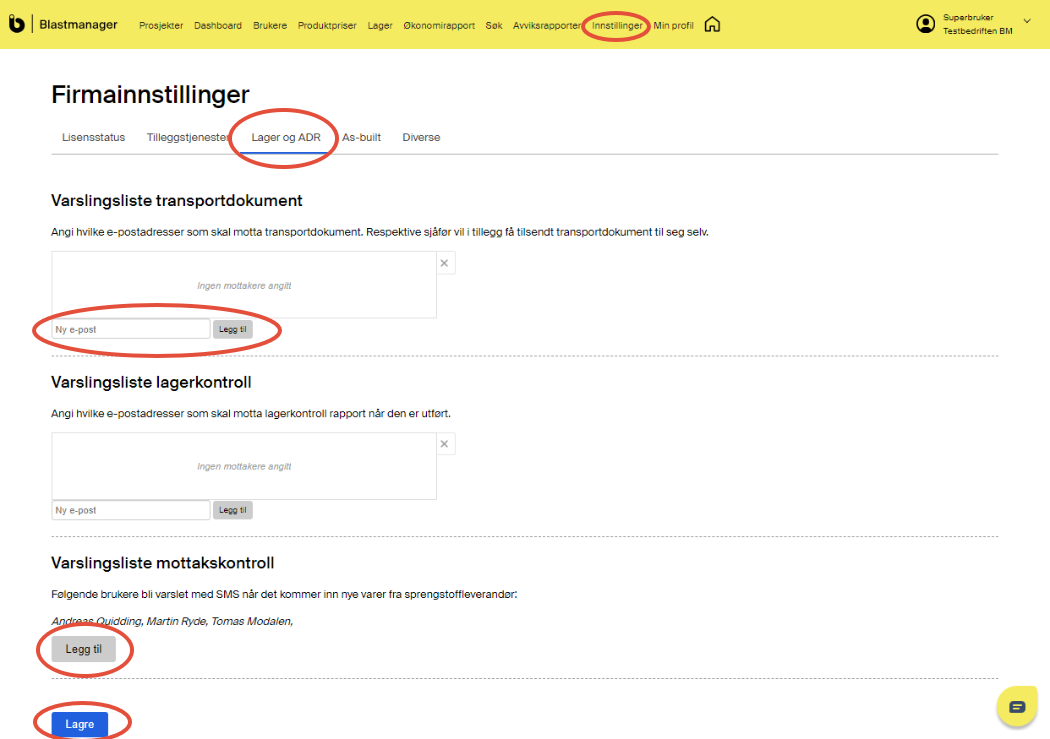 I Blastmanager kan du sette opp varslinger for transportdokument, lagerkontroll, og mottak av varer fra din sprengstoffleverandør. Du angir e-post adresser som vil motta e-post med kopi av transportdokument som blir opprettet, eller dersom en bruker utfører en lagerkontroll. For mottak av varer brukes mobilnummer og det vil bli varslet på SMS når nye varer er levert fra leverandør.