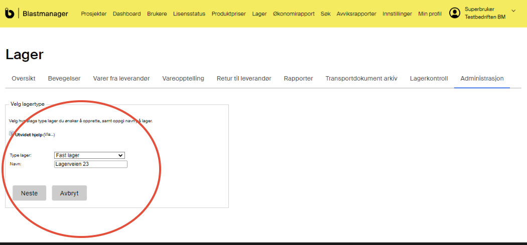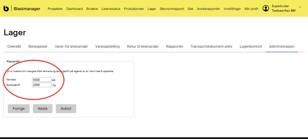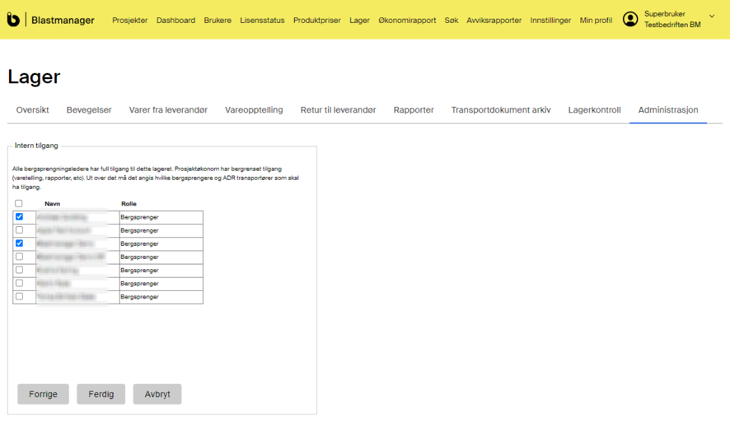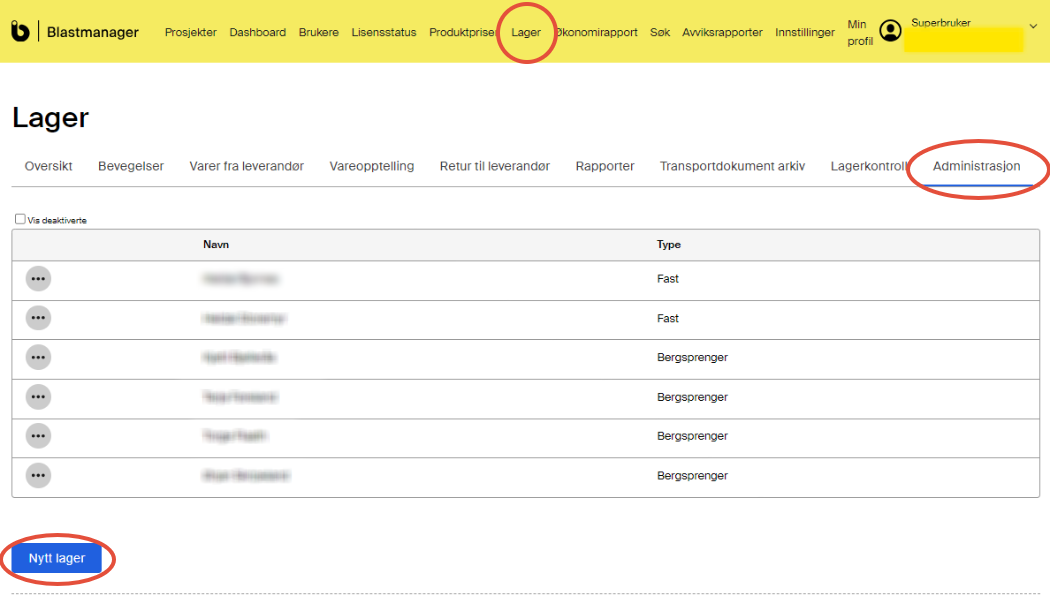 I Blastmanager kan du som er Superbruker opprette sprengstofflagere og gi tilgang til brukere i ditt selskap. Tilgang kan gis til brukere med rollen Bergsprenger eller ADR-transportør. Brukere med tilgang til sprengstofflager kan utføre transaksjoner, vareopptelling og generere transportdokument . Du kan opprette faste eller mobile lager, og angi maksimum mengde tillatt sprengstoff og tennmidler.