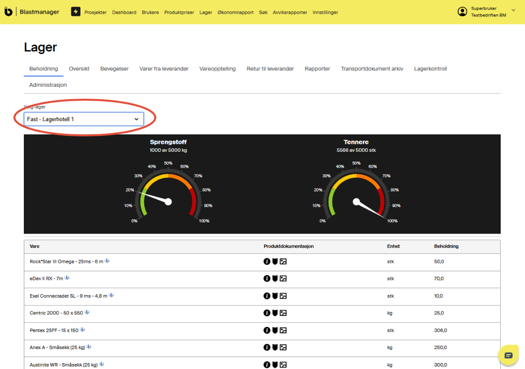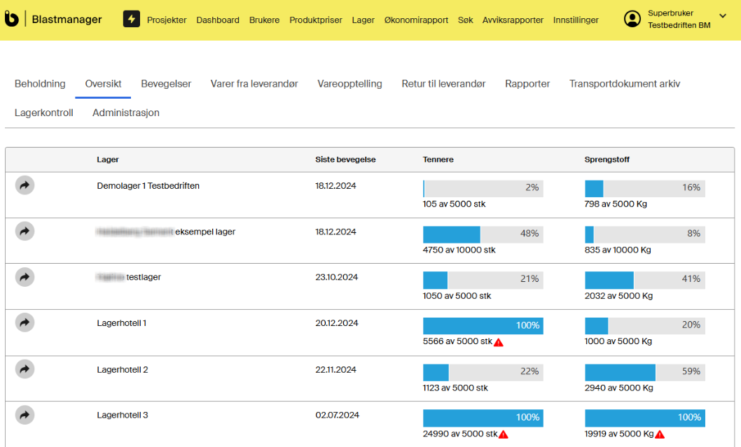 Lagerløsningen gir din bedrift full oversikt over beholdningen i deres sprengstofflager. Du kan enkelt se hvilke varer du har på lager med tilhørende mengder. Du vil også se totalen av sprengstoff og tennmidler i forhold til mengdebegrensningen som er satt på det aktuelle lageret.