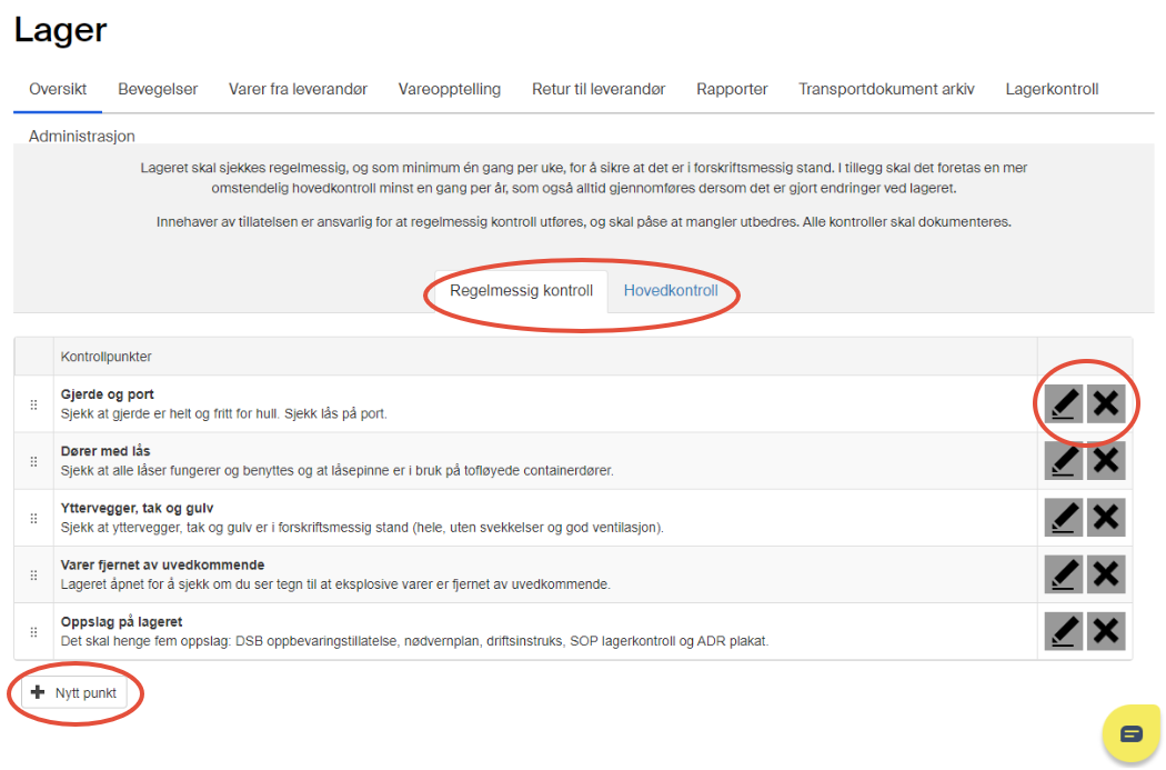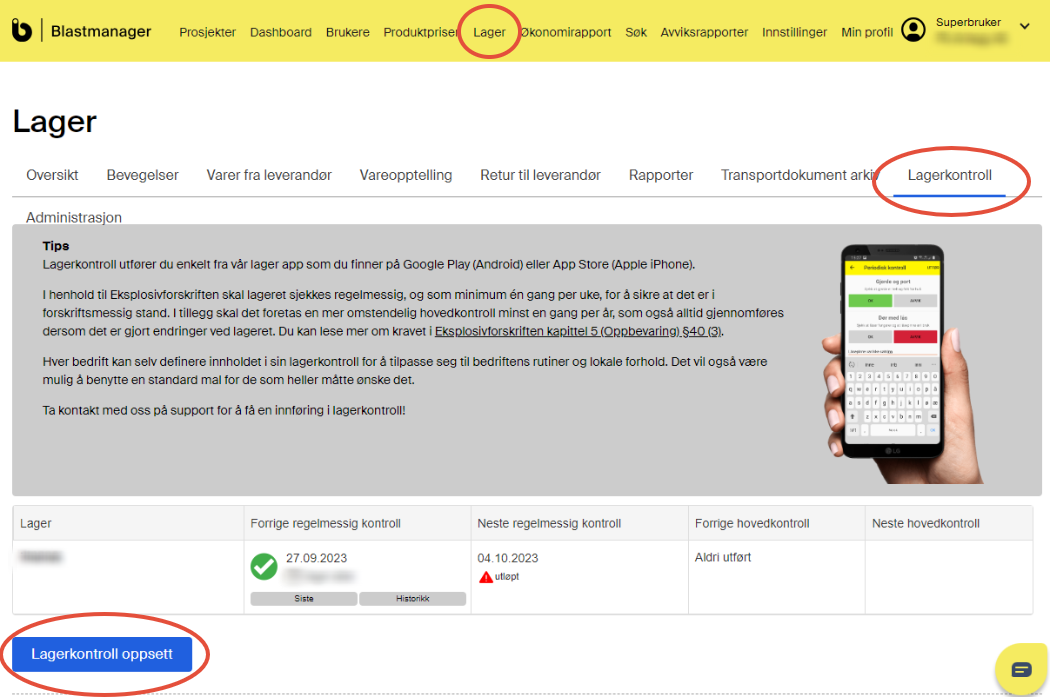 Selskap som disponerer egne sprengstofflager, og har ansvaret for sikker drift av disse, skal utføre ukentlig og årlig kontroll av oppbevaringsstedet. I Blastmanager er det Superbruker som administrerer oppsett av lagerkontroll. Du kan, i tillegg til å opprette egendefinerte punkter, også bruke de forhåndsdefinerte punktene og supplere med egendefinerte punkter.