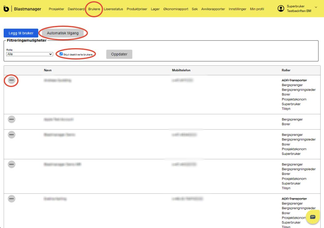 Som superbruker har du rettighet til å gi tilgang til Blastmanager for ansatte i din bedrift, det vi i systemet kaller brukeradministrasjon. Du har også mulighet til å håndtere tilganger internt i hvert prosjekt.