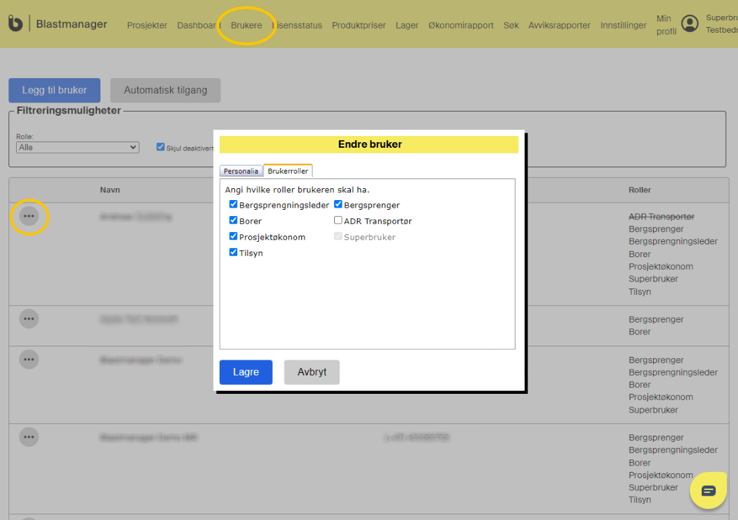 Som Superbruker kan du endre personopplysninger og roller for dine eksisterende brukere. Slik gjør du for å endre en bruker: