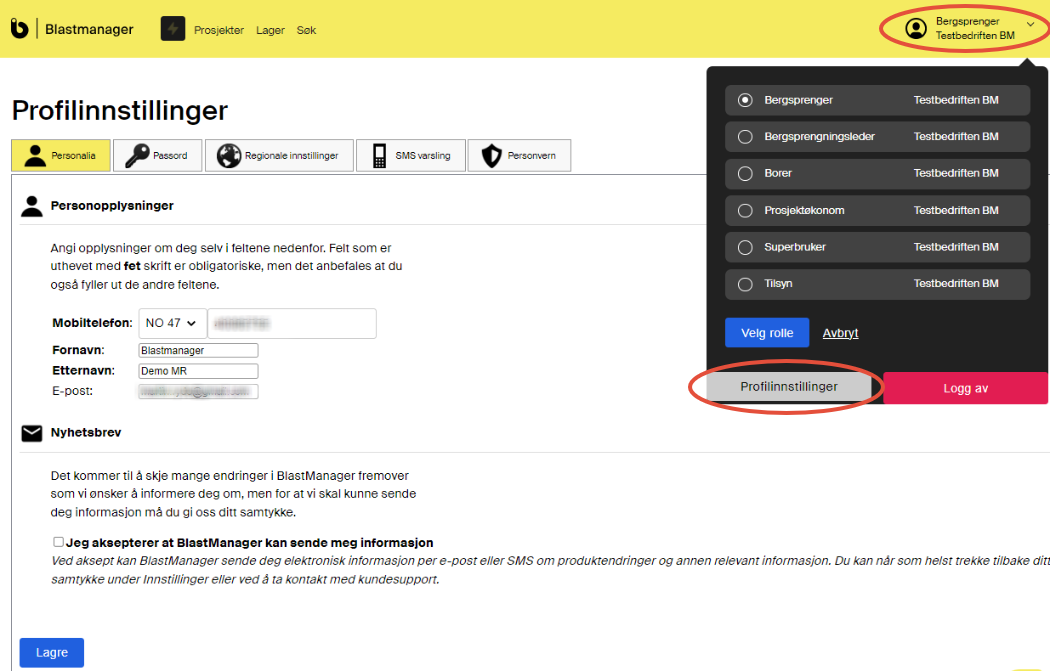 Alle brukere i blastmanager har tilgang til sine profilinnstillinger, som man finner under Profilinnstilinger under dine roller som du velger øverst til høyre på siden.