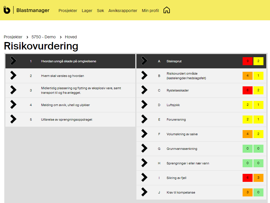 Riskovurderingen, som er en del av sprengningsplanen, utgjør en stor del av prosessen når du oppretter nytt prosjekt eller ny sprengningsplan. Gjør man en bra og grundig jobb her, sparer du mye tid ved neste prosjekt.