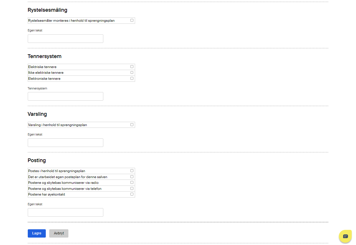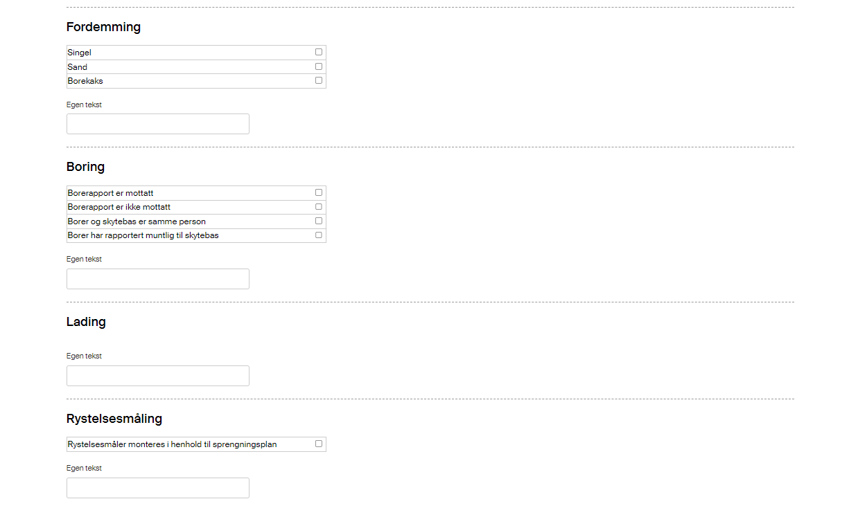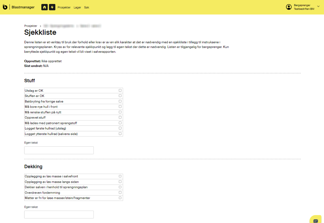 I prosjektet har du mulighet til å kreve at bergsprenger gjennomgår en sjekkliste. Sjekklisten kan brukes der forhold eller krav er av slik karakter at det er nødvendig med en sjekkliste i tilegg til instruksene i sprengningsplanen.