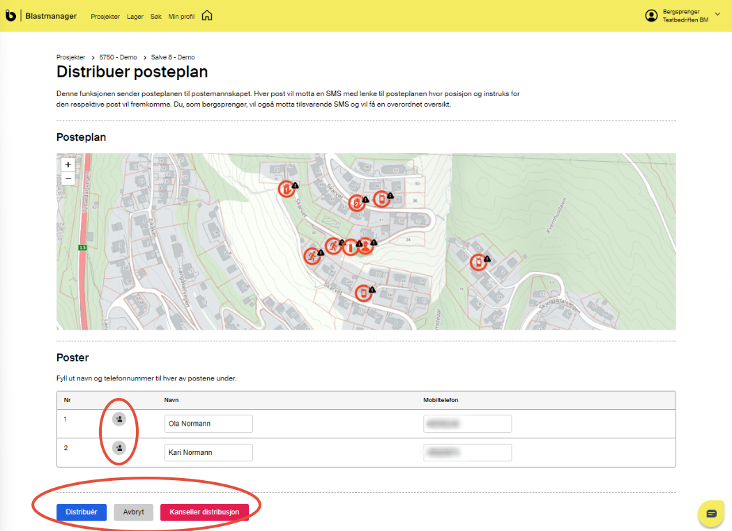 Når du har laget en salveplan med tilhørende posteplan, kan du distribuere denne til postemannskapet via SMS. Alle vaktpostene vil da få tilsendt SMS med en lenke som åpnes og vedkommende kan se instruksen for sin vaktpost. I tillegg kan vaktposten også se posisjonen hen skal stå, og avstanden dit. Vaktpostene Bekrefter at de er på sin post og bergsprenger kan se oversikt over hvilke poster som er på plass.