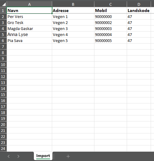 - I Excel legger du inn navn, adresse, mobil og landskode