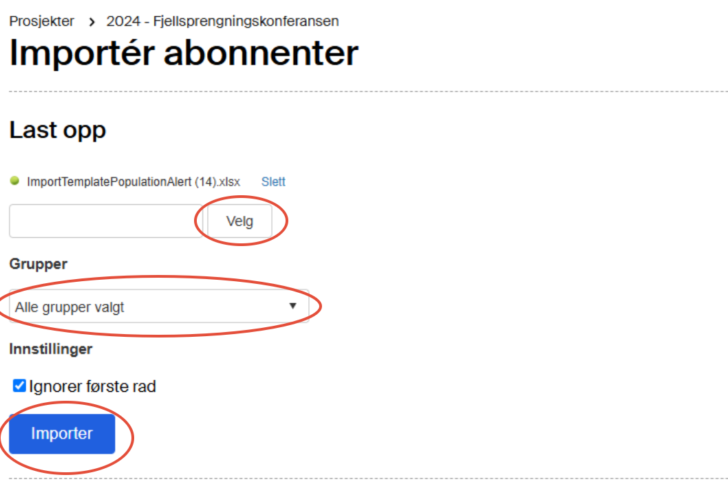 - Under Last opp velger du Exceldokumentet, tilordner gruppe, deretter trykk importer