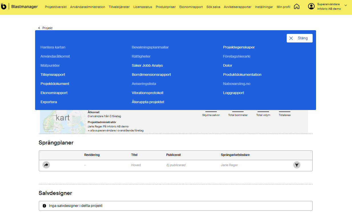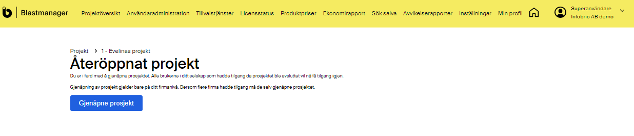 Det kan var så att ett avslutat projekt startar upp igen eller att du behöver göra någon form av tillägg på ett redan avslutat projekt. Som Superanvändare och Sprängarbetsledare har du därför möjlighet att återuppta avslutade projekt.