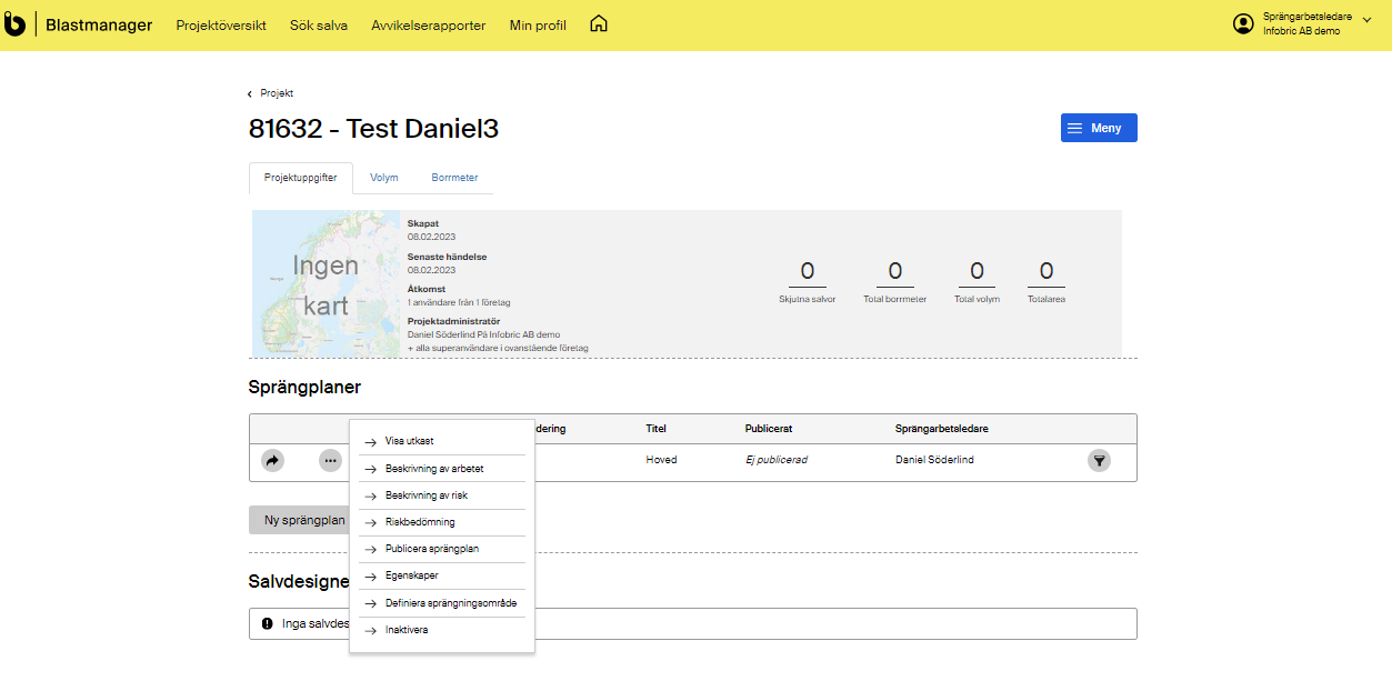 OBS! Det är endast Sprängarbetsledare som kan skapa sprängplaner. Är du inloggad som Superanvändare kan du inte skapa sprängplaner. Alternativen för Skapa sprängplan är då inte tillgängliga utan denna måste skapas senare av någon med rollen Sprängarbetsledare.