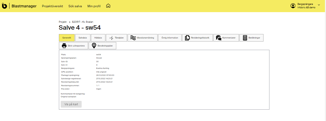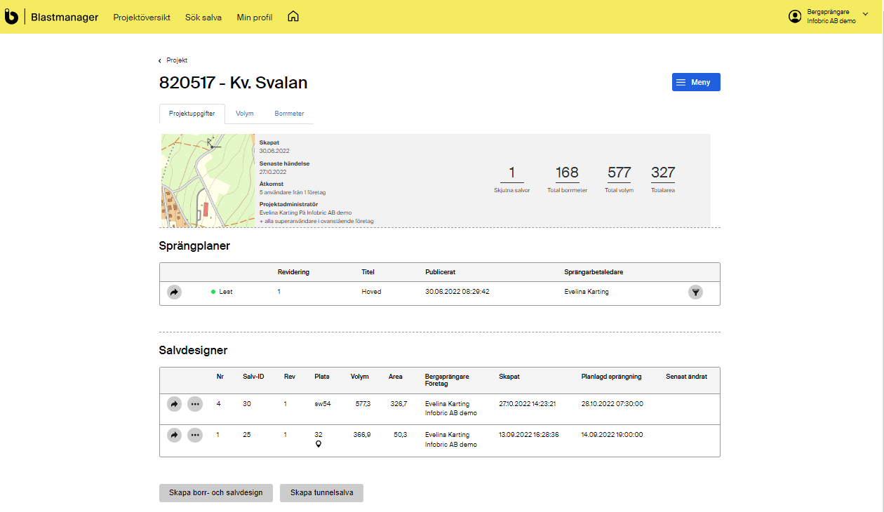 I Blastmananger kan du som Bergsprängare skapa salvdesigner för dina projekt. Alla andra roller har endast läsbehörighet. Salvdesignen är utformad för att Bergsprängaren på ett tillfredställande ska kunna sköta planeringen av salvan. Vid eventuella felaktiga inmatningar kommer systemet att varna, och korrigering krävas. Salvdesignen består av fördefinierade fält där tekniska data läggs in för att beräkna viktiga parametrar för dina salvor.