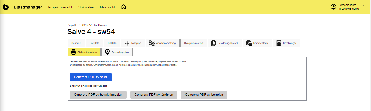 OBS! Du kan även skriva ut enskilda dokument från samma vy. Välj från alternativen: Generera PDF av bevakningsplan, Generera PDF av tändplan och Generera PDF av borrplan.
