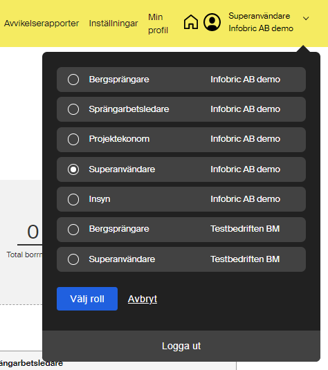 Det är inte ovanligt att man har flera rättighetsroller, eller att rollerna kan variera från olika projekt. Därför bör du alltid vara vaksam över vilken roll som är vald, och i de fall där det behövs byta roll för att få åtkomst till relevanta funktioner och projekt.